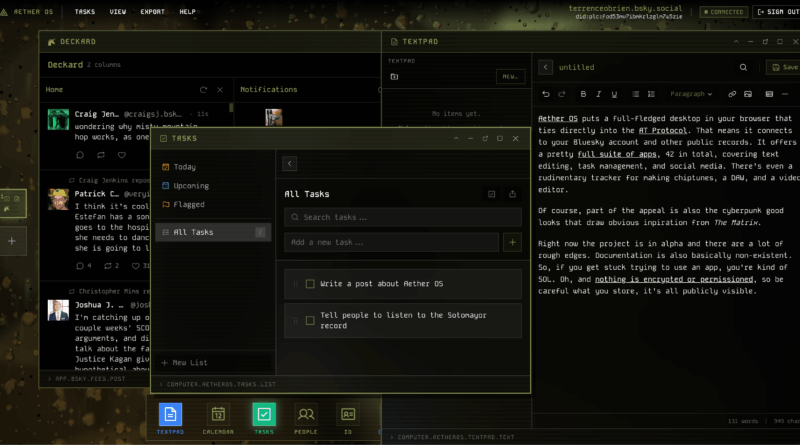 Aether OS puts a full-fledged desktop in your browser that ties directly into the AT Protocol. That means it connects to your Bluesky account and other public records. It offers a pretty full suite of apps, 42 in total, covering text editing, task management, and social media. There’s even a rudimentary tracker for making chiptunes, a DAW, and a video editor.