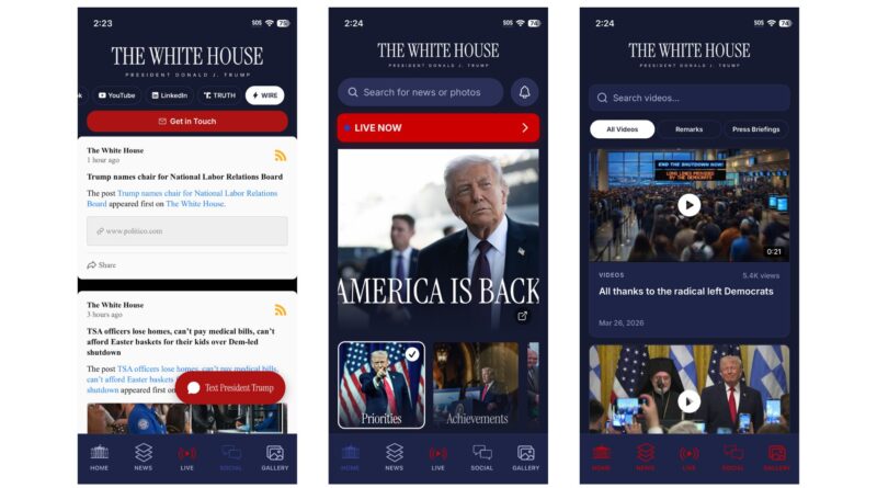 A handful of tabs in the app mostly replicate pages that exist on the Trump Administration’s version of the White House website, including news, livestreams, social feeds, and a gallery. A prominent “Get in Touch” button on the social feeds tab inc …